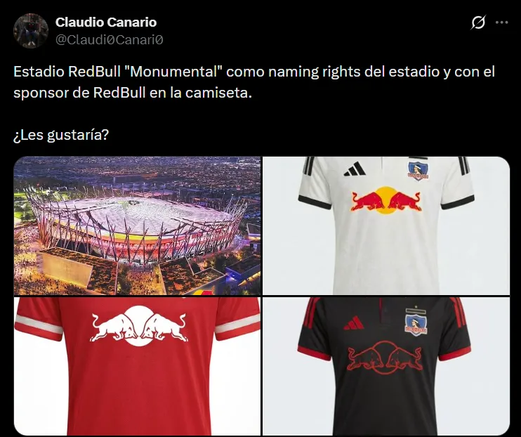Red Bull regresó a Colo Colo como auspiciador este 2025. (Foto: Colo Colo)La pregunta fue lanzada por el panelista del medio partidario del Cacique, @popularyeterno, conocido como Claudio Colo Colo en X, quien abrió el debate al citar una de las últimas publicaciones del club con la bebida energética junto a una propuesta que no pasó desapercibida: “Estadio Red Bull ‘Monumental’ como naming rights del estadio y con el sponsor de Red Bull en la camiseta. ¿Les gustaría?”.