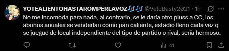 “Todo el rato… es la única posibilidad de mejorar el estadio”, comentó un usuario. En la misma línea, otro fanático señaló que “No me incomoda para nada, al contrario, se le daría otro pluss a CC”, mientras que otro destacó que “Seria genial la idea”.