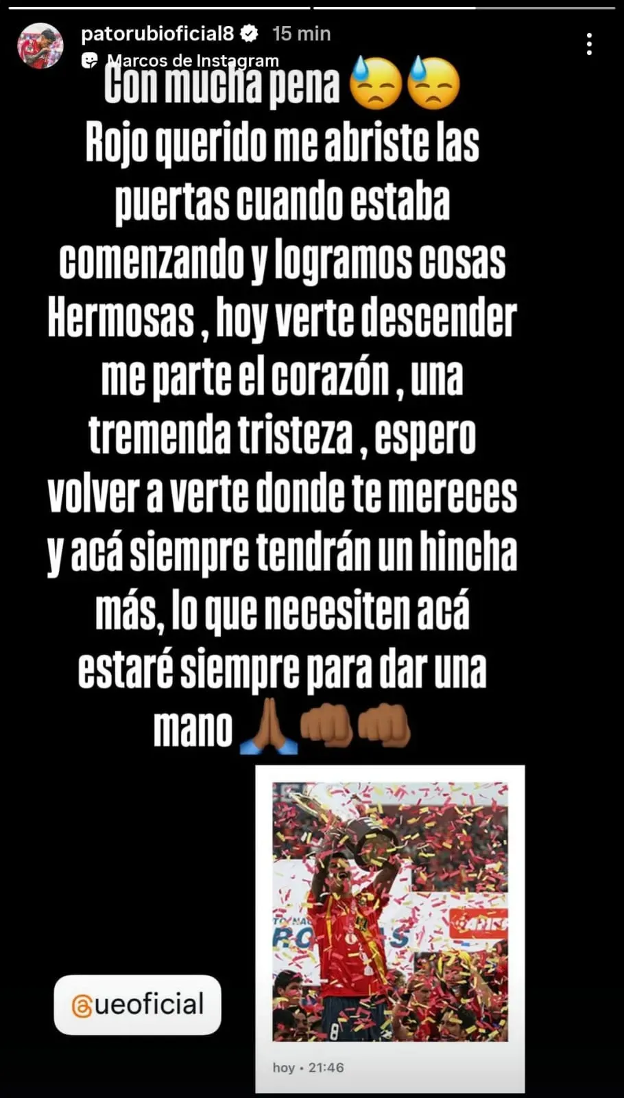 “Con mucha pena. Rojo querido me abriste las puertas cuando estaba comenzado y logramos cosas hermosas. Hoy verte descender me parte el corazón, una tremenda tristeza”, partió diciendo.