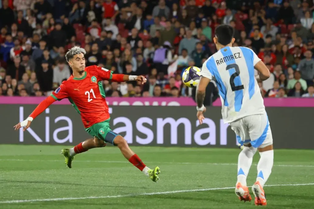 Antes de la media hora, el equipo dirigido por el belga Mohamed Ouahbi puso el 2-0. Un tanto que fue durísimo para la Albiceleste. Todo partió en los pies de Maamma, quien apiló rivales por la banda derecha. Ubicó a Zabiri con un preciso centro y el atacante de 20 años definió con una volea impresionante.