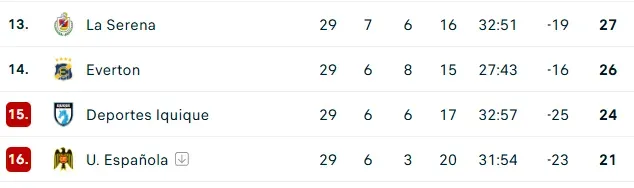 Dos equipos pelean en el fondo de la tabla por ser el segundo descendido de la temporada. Aunque, incluso, podría sumarse un tercero en la disputa. Por un lado, Deportes Iquique, con 24 unidades, es el que más chances tiene de irse a la B, por estar a dos puntos del rival más directo, Everton de Viña del Mar.