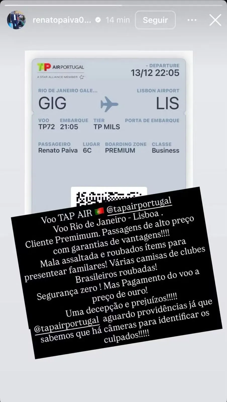 “Vuelo de Río de Janeiro-Lisboa. Cliente premium. ¡¡¡Pasajes de alto precio con beneficios de garantía!!!! Maleta robada con regalos familiares! ¡Varias camisetas de clubes brasileños robadas! ¡Cero seguridad! ¡Pero pago del vuelo al precio del oro! Una decepción y una pérdida!!!!!”, explicó.