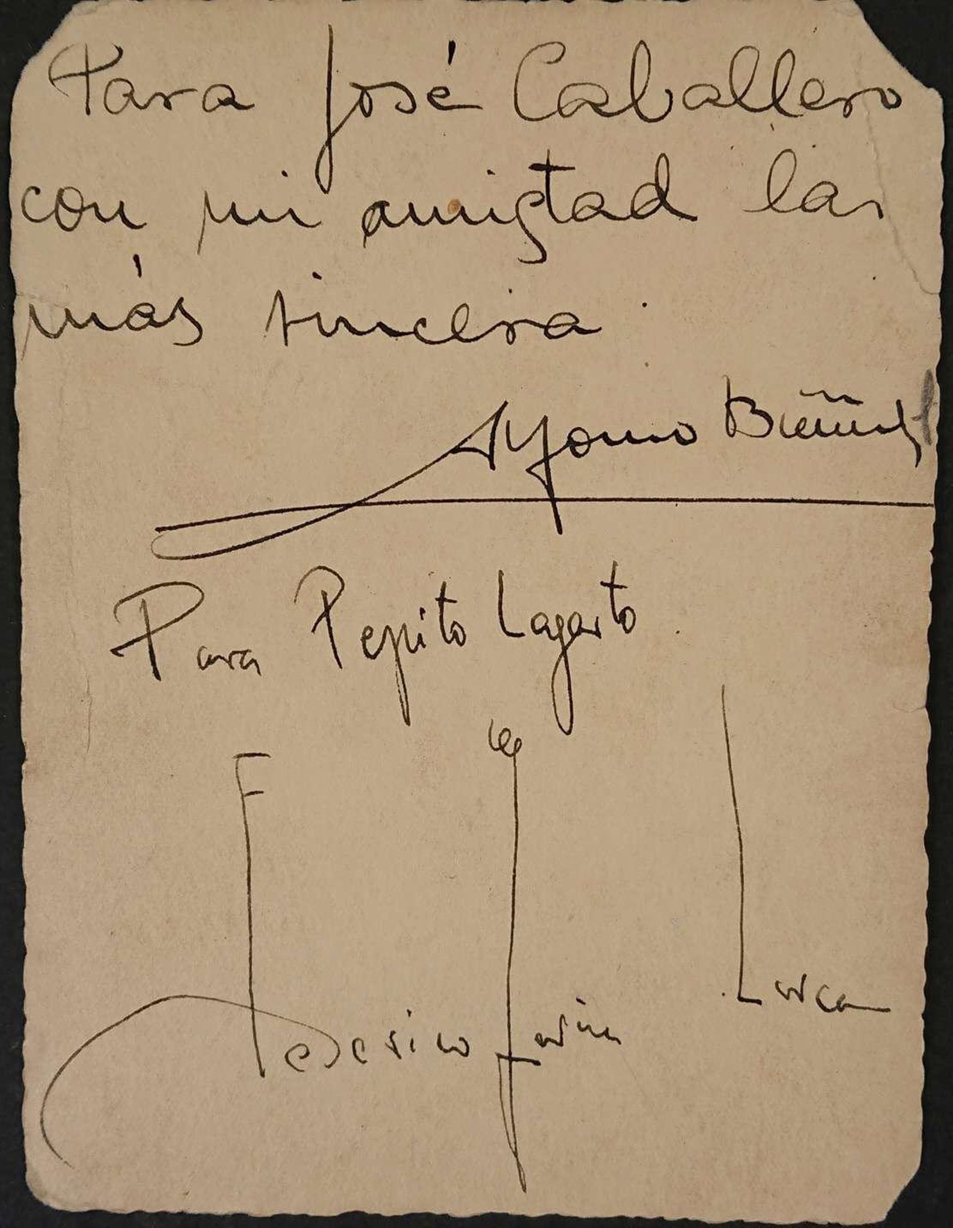 De la amistad entre Lorca y Caballero dan testimonio también en la exposición imágenes compartidas, como una del 29 de junio de 1936 en la Glorieta de Atocha de Madrid durante la verbena de San Juan; y un retrato que le mandó el poeta granadino, en el que le llamaba cariñosamente 'Pepito Caballero', junto a otra carta en la que bromeaba el autor de 'Poeta en Nueva York' llamándole 'Pepito Lagarto'.