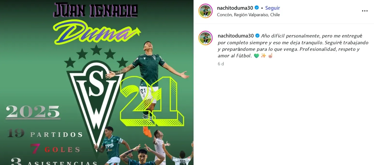 Según revela el portal Caturros.cl, Juan Ignacio Duma reveló que no ha recibido ningún acercamiento para renovar su contrato con Wanderers, señalando que debido a eso, el jugador ya piensa en otras alternativas y comienza a evaluar ofertas.