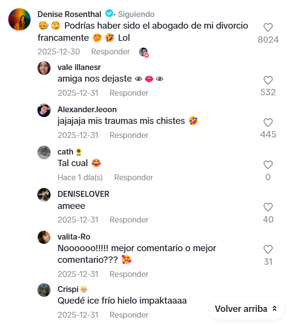 Dicho tiktok no tardó en ganar popularidad entre la comunidad virtual, recolectando una serie de comentarios. Y a este se sumó el de Denise Rosenthal que escribió sutilmente: "Podrías haber sido el abogado de mi divorcio francamente. Lol". En tanto sus fans reaccionaban señalando: "Mis traumas mis chistes", "mejor comentario o mejor comentario?", "quedé ice frío hielo impaktaaaa", "jajaja en shock".