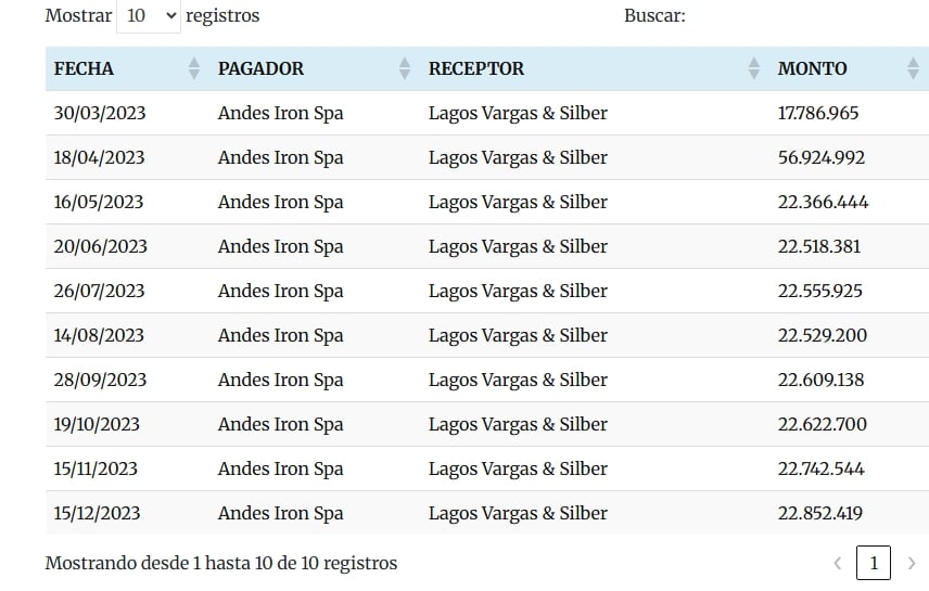 Las cartolas bancarias de la sociedad Lagos, Vargas y Silber Asesorías Legales Limitada, consultadas por Reportea, registran diez transferencias consecutivas desde Andes Iron.