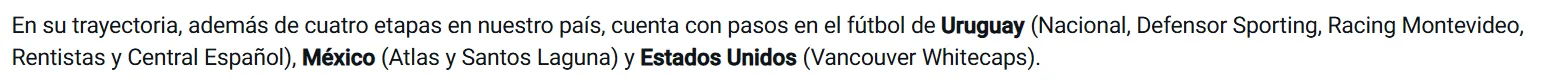 De hecho, en la reseña se mencionaron sin inconvenientes los países y numerosos clubes que defendió en el extranjero, nombrando a Nacional, Defensor Sporting, Racing de Montevideo, Rentistas y Central Español en Uruguay, además de Atlas y Santos Laguna en México y Vancouver Whitecaps en Estados Unidos.