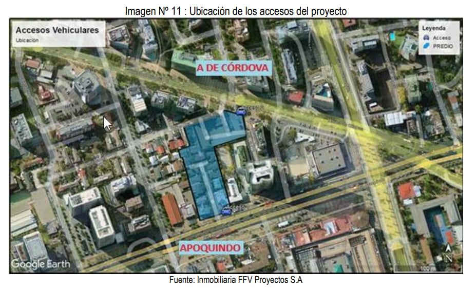 El proyecto se emplaza continuo a las calles de Rosario Norte, Edipo Rey Apoquindo y Alonso de Córdoba, teniendo salidas por estas dos últimas.