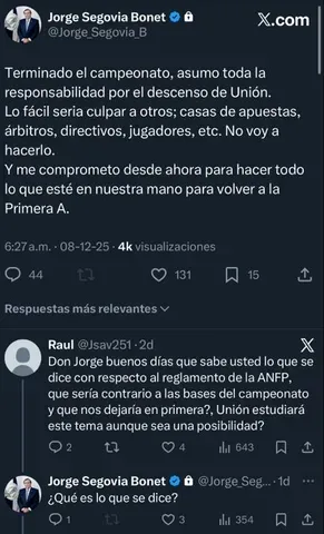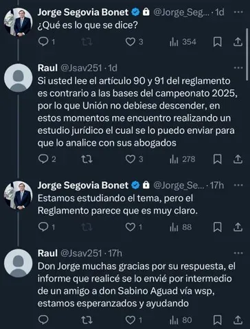“Don Jorge, buenos días. Qué sabe usted de lo que se dice con respecto al reglamento de la ANFP, que sería contrario a las bases del campeonato y que nos dejaría en Primera. ¿Unión estudiará este tema aunque sea una posibilidad?“, le consultó a Segovia un hincha identificado como Raúl en el ex Twitter.