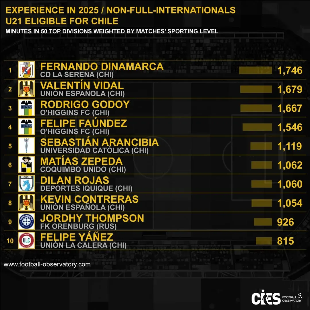 El sitio reconocido por sus estadísticas y análisis, no tan solo contabiliza los minutos disputados este año y que se relaciona con la regla impuesta por los minutos Sub 21. A su vez también contempla el rendimiento del jugador y sus condiciones físicas en cada partido que completó en cancha. Pero sorpresivamente no hay jugadores ni de Colo Colo ni de Universidad de Chile.