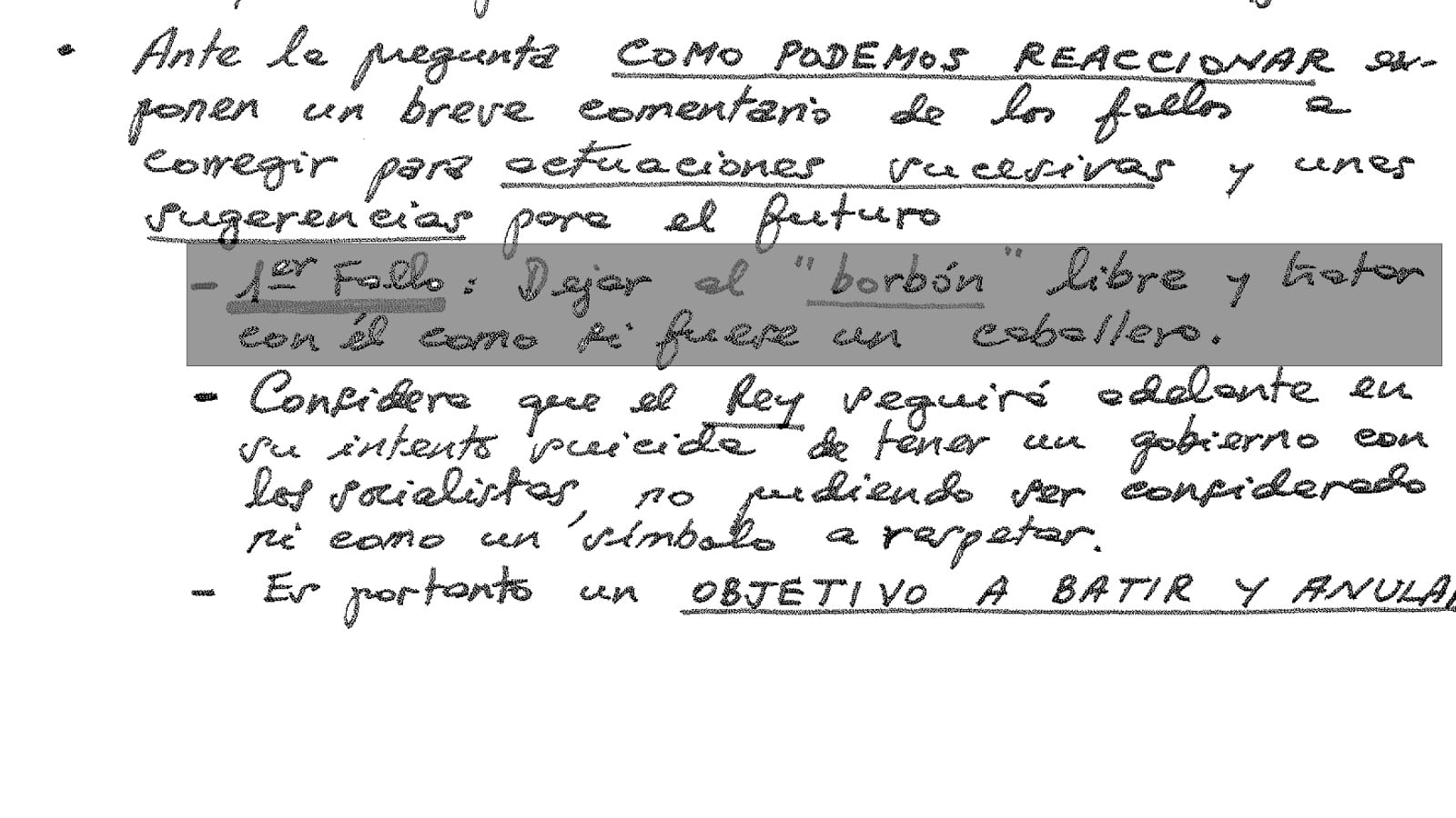Un documento manuscrito sin autoría titulado “Panorámica de operaciones en marcha”, de noviembre de 1980, detallaba tres planes de intervención (civiles, militares y mixtas cívico-militares). Se había podido leer en 23F. La pieza que falta del militar golpista Ricardo Pardo Zancada. Ahora está a disposición la versión completa. De entre las tres operaciones descritas, la menos sofisticada y con los dirigentes de más bajo rango fue la que acabó ejecutándose (calificada como de “expontáneos” [sic] en el manuscrito). También era la que se consideraba más viable al apuntarse “serios temores de que el hecho pueda ejecutarse y que triunfe”. El análisis sitúa a uno de los padres de la Constitución, Manuel Fraga, en dos de los tres escenarios golpistas de tinte militar. En una de las alusiones directas se señala que “1 político (Fraga)” había logrado convocar “a varios generales” en la “costa levantina”. En otra se señala que “el Rey operaría constitucionalmente” y, “al no haber cobertura política de partido, Fraga estaría intentando ser el líder civil”.