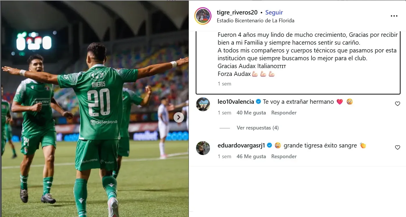 A través de sus redes sociales, el jugador compartió un sentido mensaje para la hinchada itálica. “Quiero agradecer a todos lo que componen la Familia de Audax Italiano, sus trabajadores a su hinchada que siempre estuvieron ahí”.
