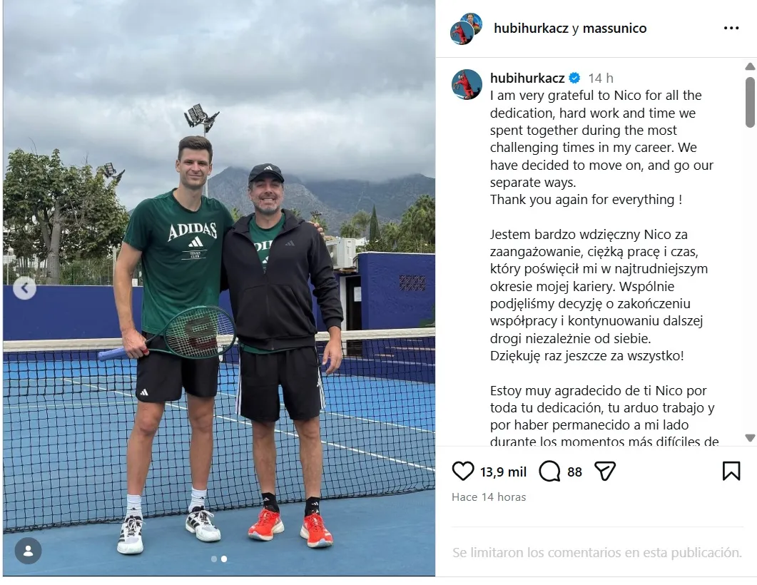Una inesperada noticia reveló el tenista polaco Hubert Hurkacz a través de sus redes sociales donde anunció el fin de su vínculo con el medallista chileno Nicolás Massú, quien desde finales del 2024 se sumó a su equipo.