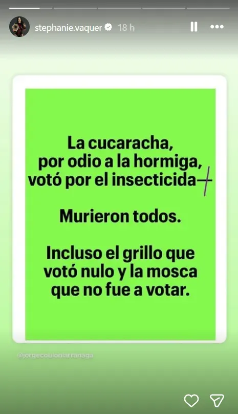 Este viernes, a solo dos días de celebrarse la segunda vuelta presidencial, donde Jeannette Jara y José Antonio Kast buscarán ser el próximo presidente del país, Stephanie Vaquer compartió una historia en su cuenta de Instagram (@Stephanie.vaquer) que causó bastante revuelo entre los usuarios de redes sociales.