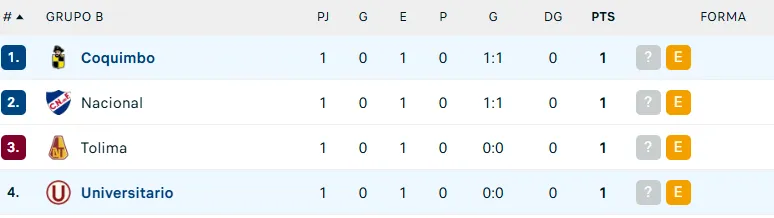 Está siendo el grupo más igualado en el torneo. Tras el empate conseguido por Coquimbo ante Nacional en el Sánchez Rumoroso (1-1) y el cero a cero del duelo entre Tolima y Universitario, todo quedó balanceado.