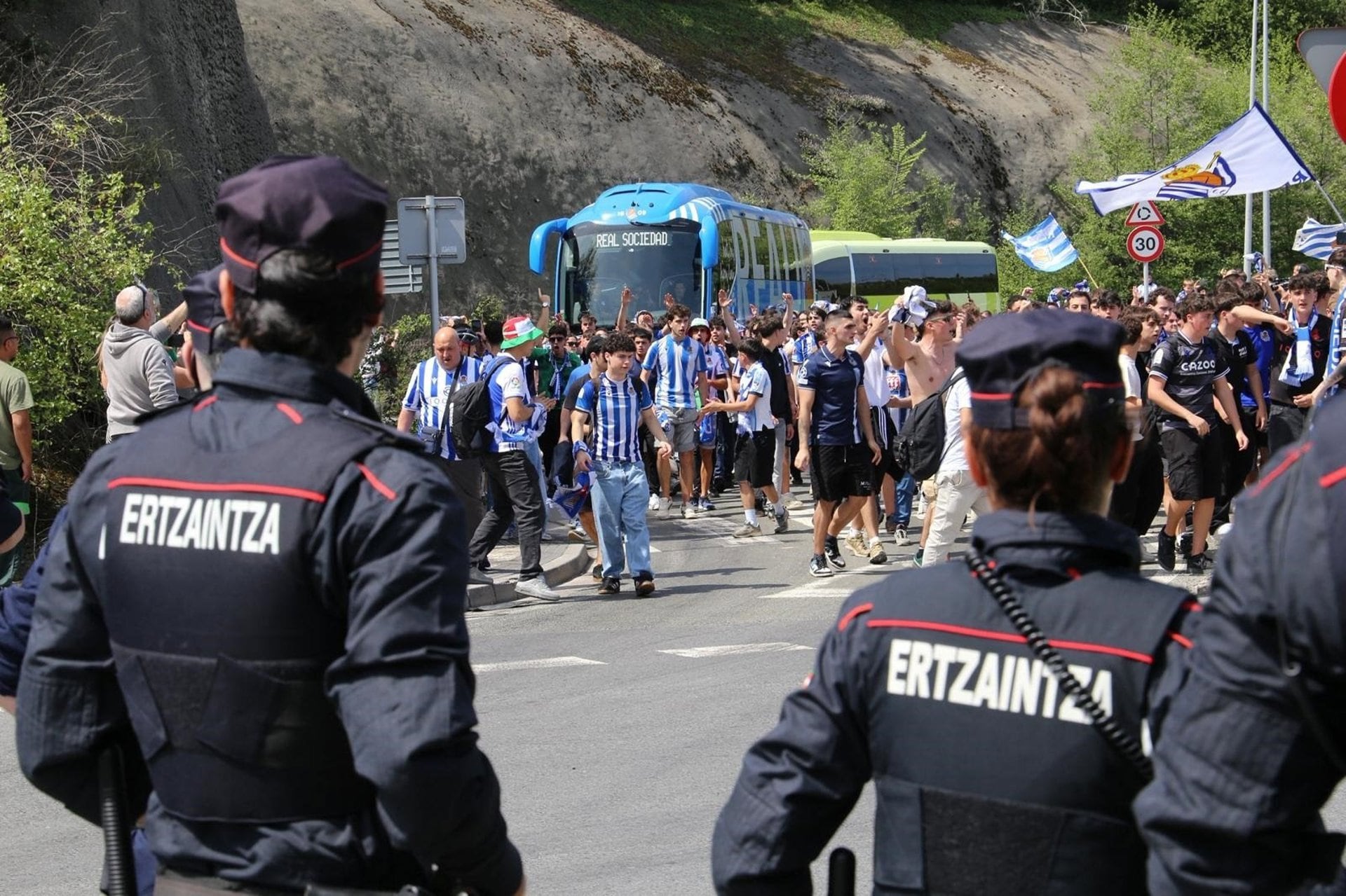 Un total de 340 efectivos de Ertzaintza y la Guardia Municipal de Donostia-San Sebastián velarán por la seguridad durante el pasacalles que recorrerá este las principales calles de la capital guipuzcoana entre el estadio del Reale Arena y el Ayuntamiento con motivo de la victoria de la Real Sociedad en la final de la Copa del Rey celebrada el sábado en la Cartuja de Sevilla.
